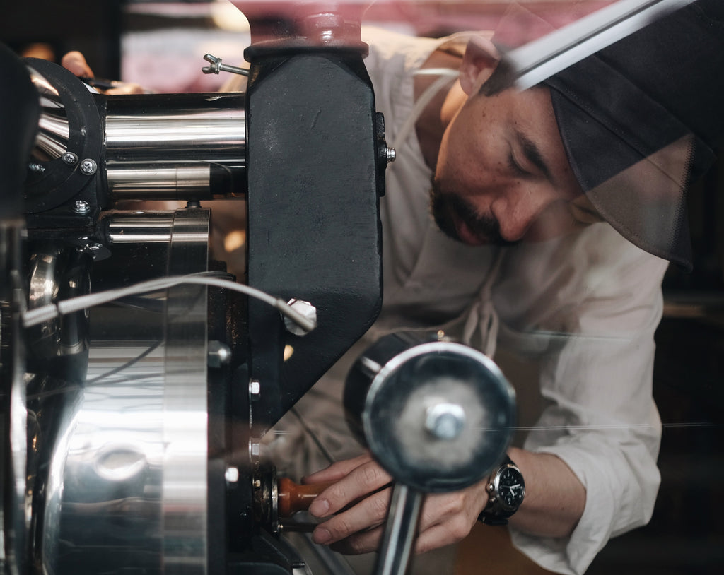 Yamamoto-san believes that the quality of the beans is the single most important factor that affects the flavor; adjusting other aspects such as upgrading the roasting machine is not substitute for recreating what the best ingredients can do. He has always used the Fuji Royal 5kg, semi hot blast type throughout his career- establishing a skill and an eye for the details to spot the exact balance of how it should be roasted.